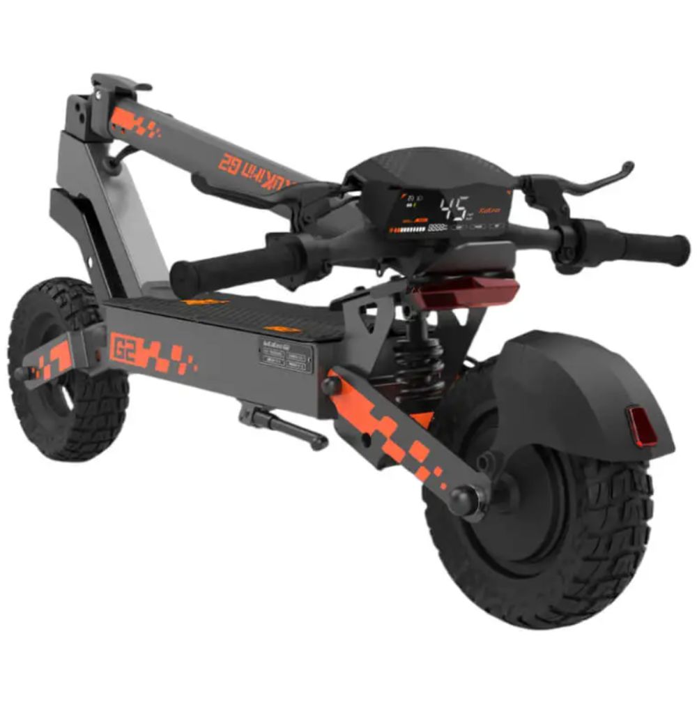 The KuKirin G2 delivers a smooth and powerful ride with its 800W integrated hub motor and sine wave acceleration, offering three-speed modes from 15 km/h to 45 km/h. Its 10-inch off-road vacuum tires and front and rear spring dampers ensure excellent grip, shock absorption, and stability on various terrains. A 48V 15Ah Li-ion battery provides up to 55 km of range, making it ideal for commuting and long rides. The high-definition touch display offers real-time ride data and intuitive controls, while the one-touch folding mechanism ensures secure transport and storage. Weighing 26 kg (65 lbs), it is lightweight, durable, and easy to carry, perfect for urban and adventure riding.