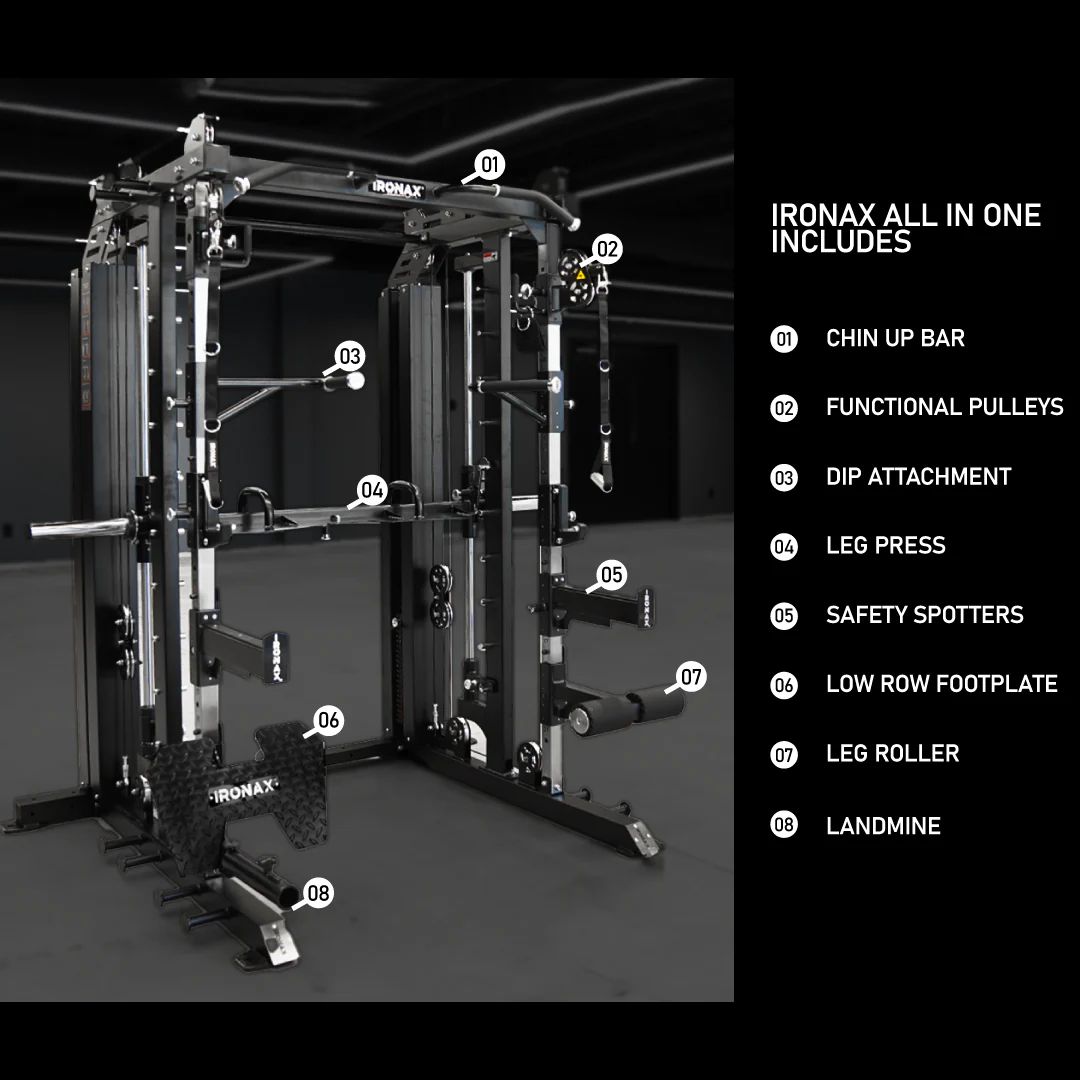 Designed to revolutionize your workout experience, the IRONAX - All-in-One Trainer is the pinnacle of functional fitness innovation in one sleek machine. With its robust construction and adjustable settings, the IRONAX empowers you to target every muscle group with precision, whether you're a seasoned athlete or just starting your fitness journey. From cable crossovers to leg presses, its comprehensive array of exercises ensures limitless possibilities for sculpting your physique and achieving your fitness goals. Say hello to the ultimate home gym solution with the IRONAX - All-in-One Trainer.